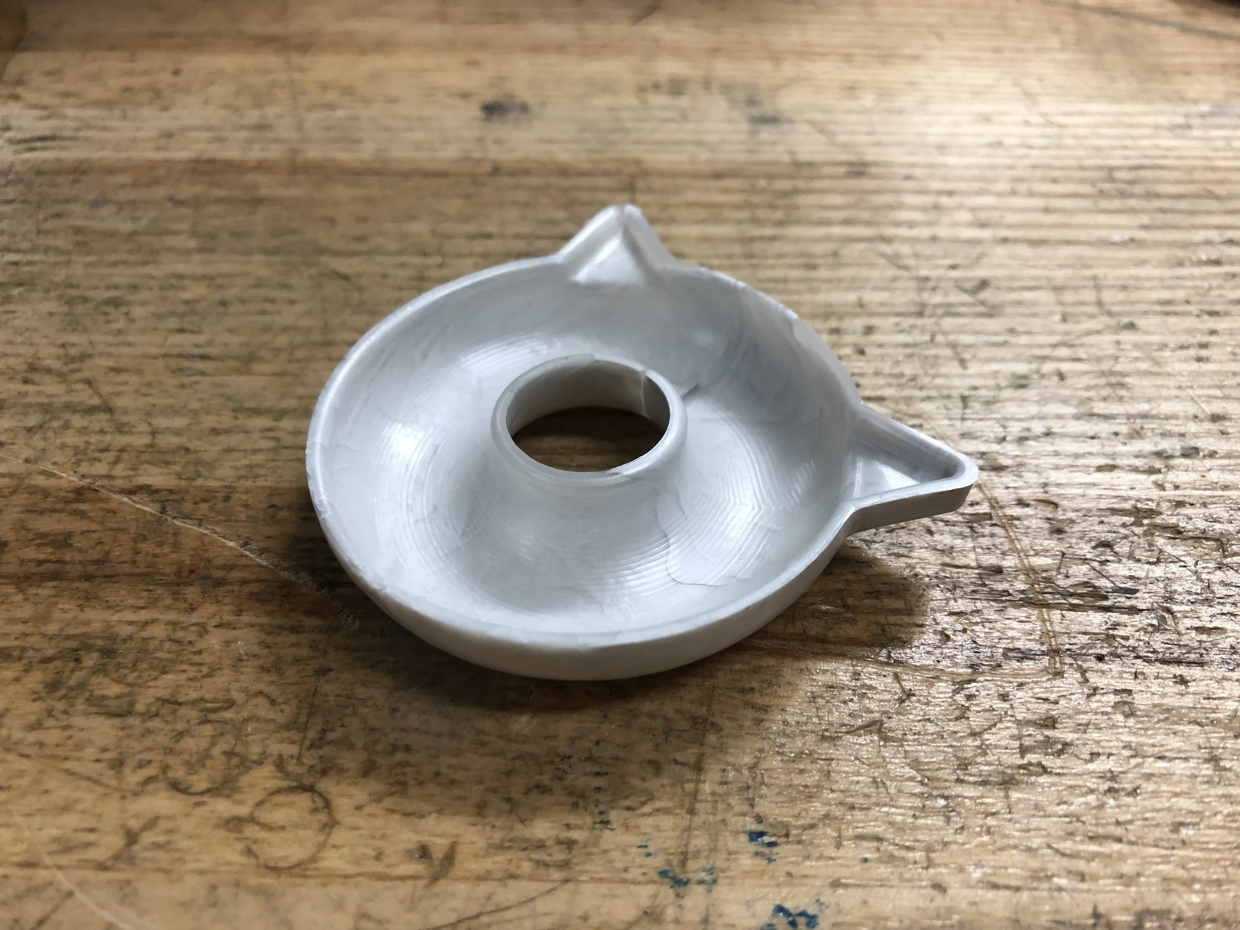 It can’t be the Cat Donut without its iconic cat ears. To create the ears, the bottom half gained thin triangles on the edge. The top half included cut-outs to allow the ears to nest cleanly. In an effort to keep a uniform wall thickness and prevent heat sink, the interior wall that would be the base of the triangle was removed.