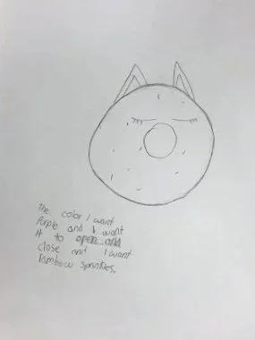 Inspired by the imagination of a local 4th grader, Cat Donut was introduced to the world in the drawing to the right.