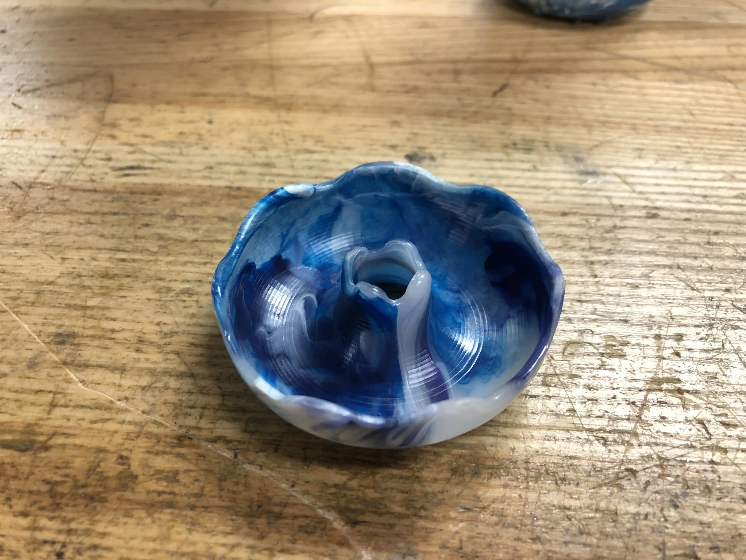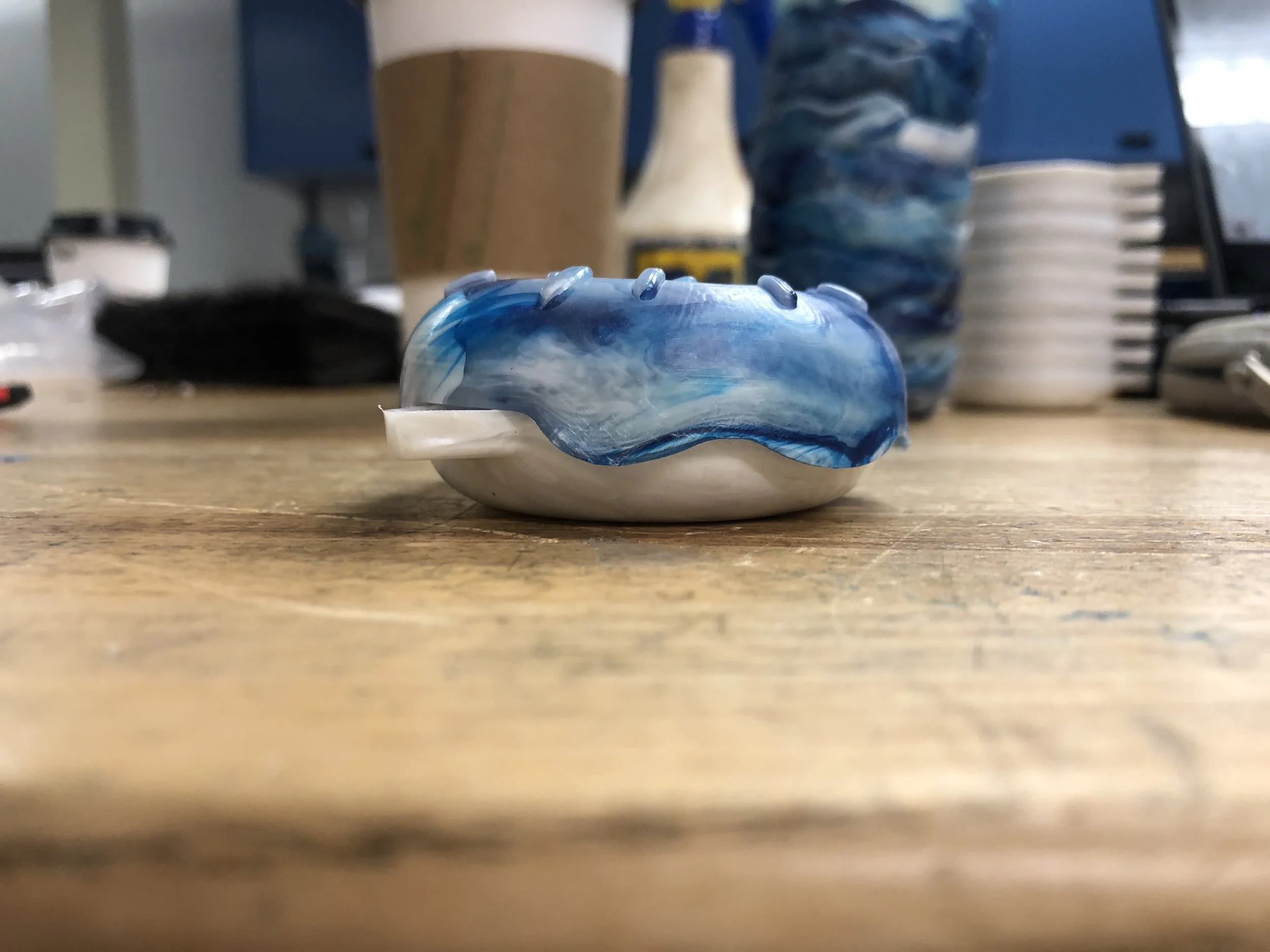 A late addition to Cat Donut, the side edge of the top half used a wave-like curved edge to mimic the drip of frosting. This feature also effectively hid any gaps between the two halves of the donut when the bottom was nested into the top.