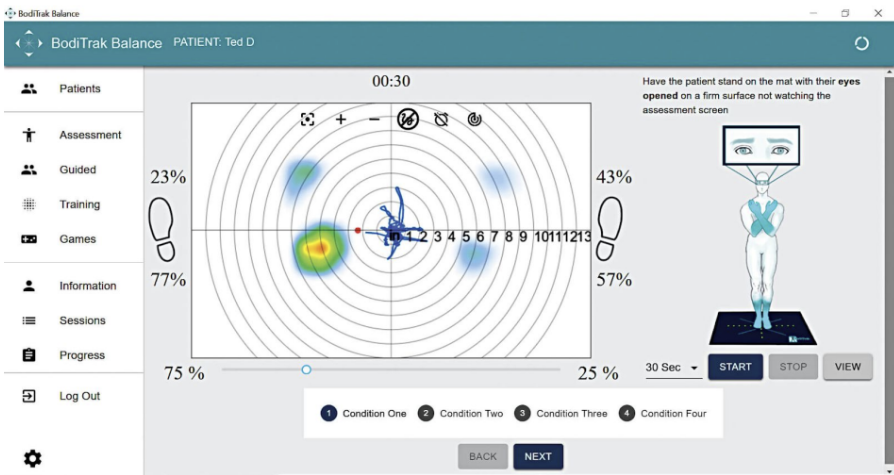 Balance and position, as measured by the BodiTrak Balance mat, tracked a patient’s movements during their exercises. With two outputs, our team measured the center of pressure during an exercise as a function of time and distance. This allowed our team to quantify the weight distribution across an exercise for an individual using proper form.