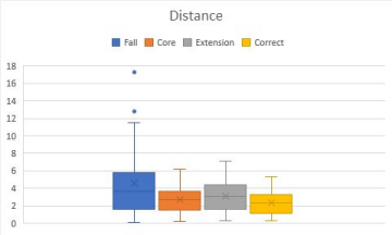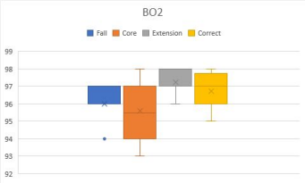 The best variable for predicting an unengaged core as the specific type of noncompliance is also distance (kind of). The t-test showed minimal differences for unengaged core sessions against the compliant control sessions for all variables. However, distance had a p-value of .074, which was closest to the desired .05 value that determines statistical significance. Given the explanation above regarding muscle control, this theory of using distance holds some weight. Since no mat variable was significant, the biofeedback criteria were brough back in. As can be seen clearly from the blood oxygenation boxplot to the right, an unengaged core session produced significantly lower readings, including a mean outside the lower bounds of every other session type. Using this data, it can be theorized that an optimal solution to checking for an unengaged core relies on checking maximum distance values (uncontrolled movements) and minimum blood oxygenation values (lack of muscle engagement).